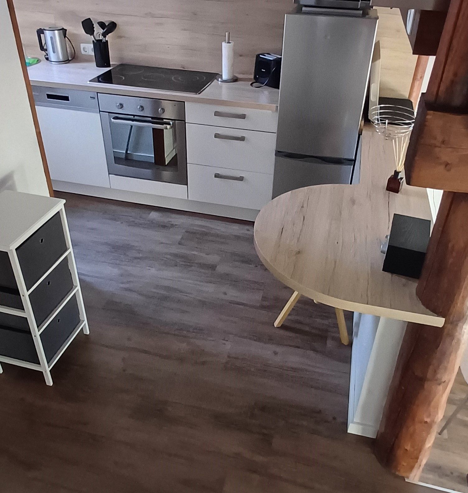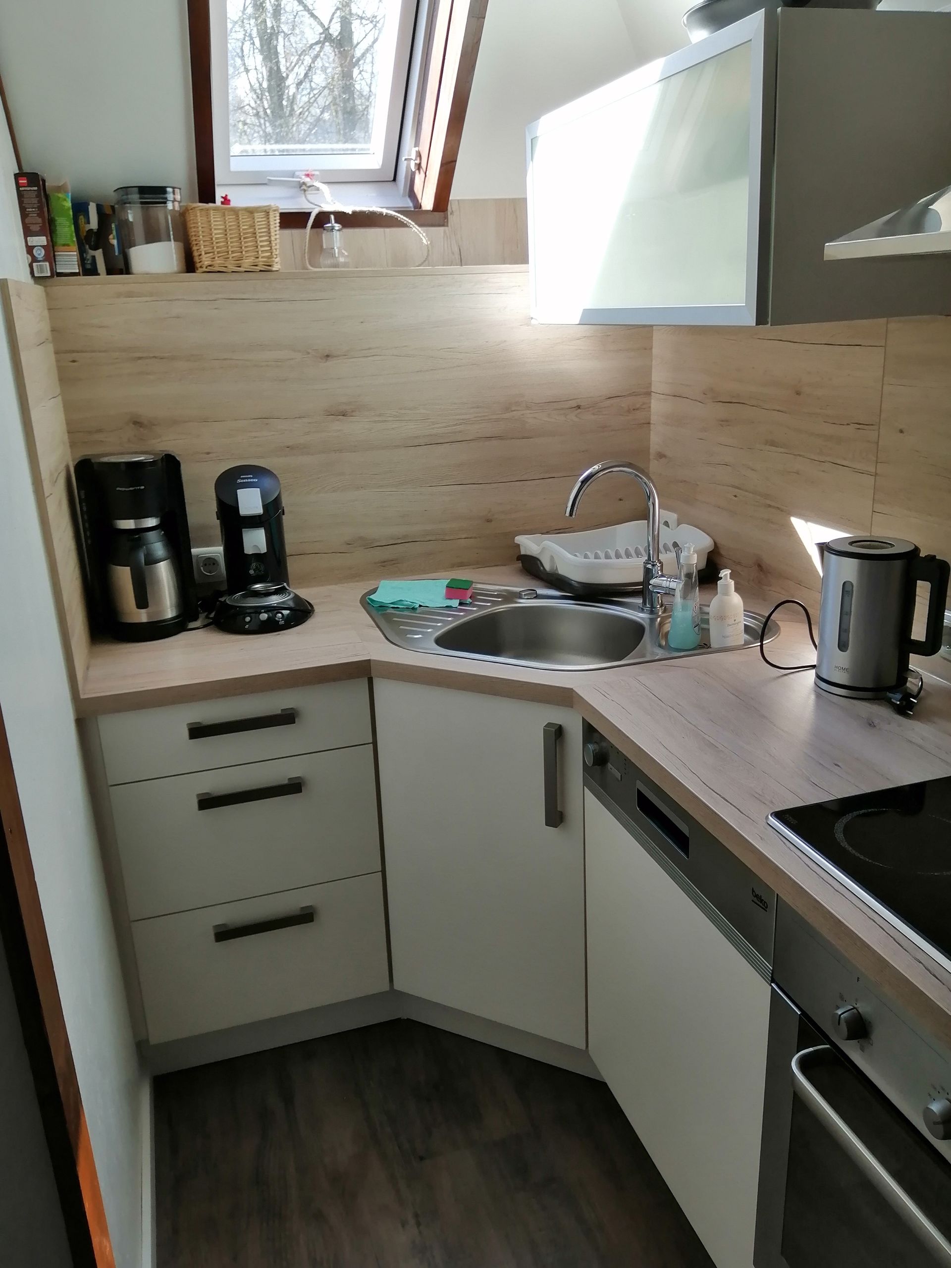 Spüle mit Ablaufbrett, 4-Platten-Herd-Ceranfeld, Ofen, Mikrowelle mit Grillfunktion, Toaster, Eierkocher, Kaffeemaschine, Senseo Kaffeemaschine, Wasserkocher, Spülmaschine für 6 Gedecke und alles, was man in der Küche sonst noch so benötigt.