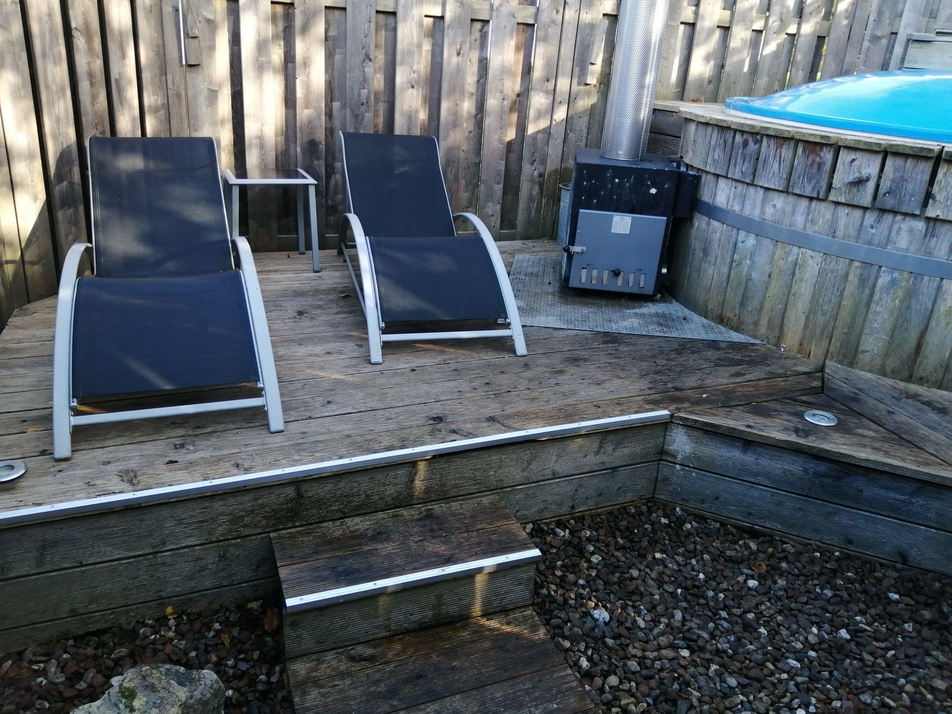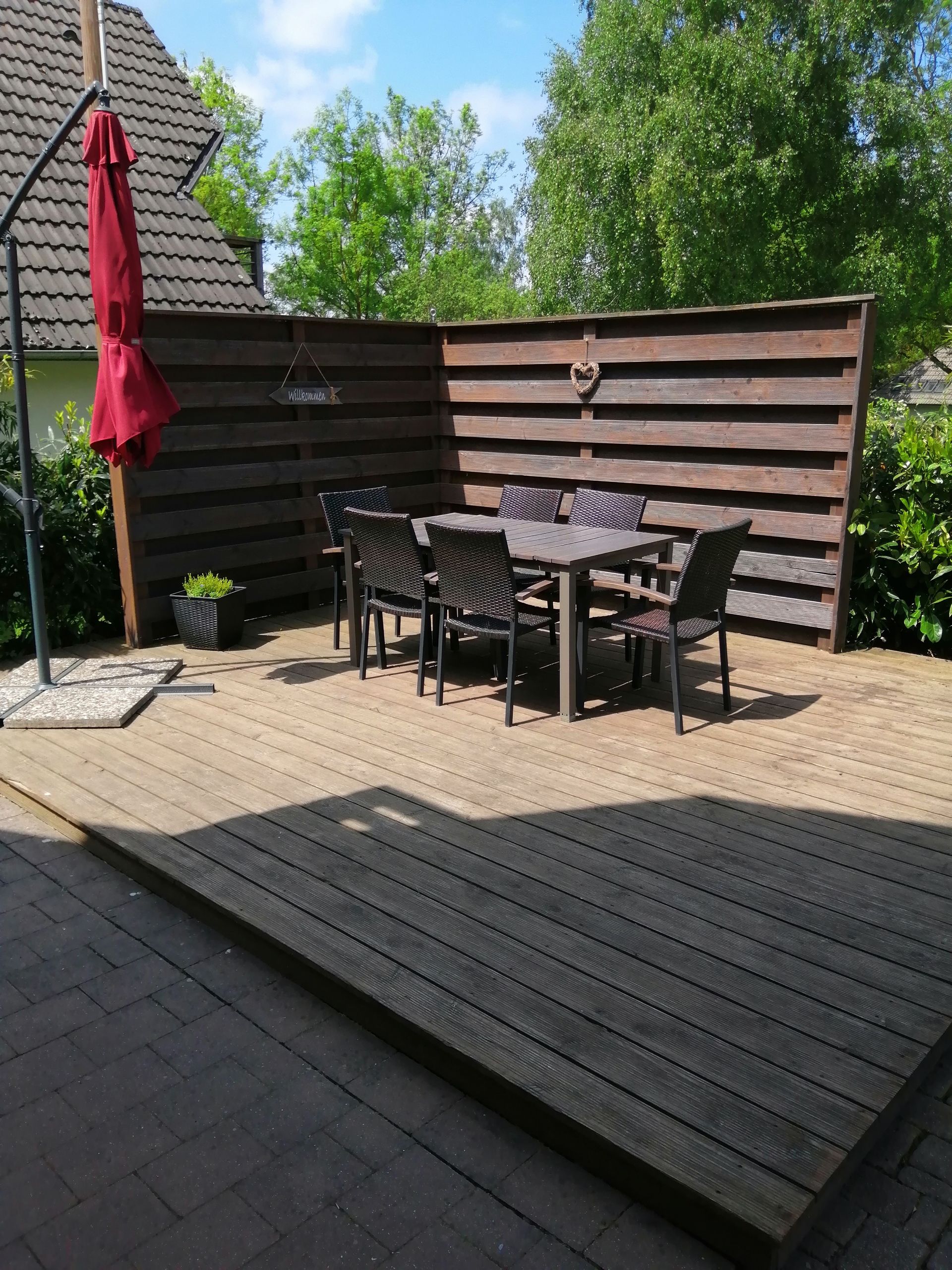 Im Außenbereich erwartet Sie eine großzügige und gleichzeitig gemütliche Terrasse, mit Gartenmöbeln, Sonnenschirm und einem großen Grill der auch als Feuerstelle genutzt werden kann.