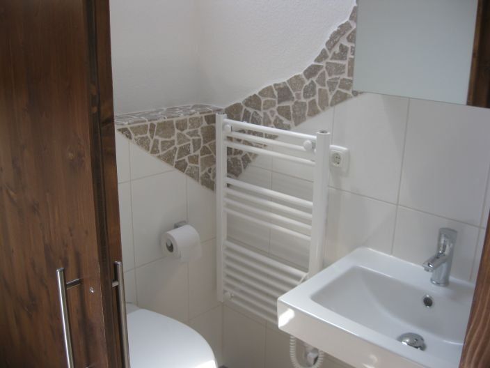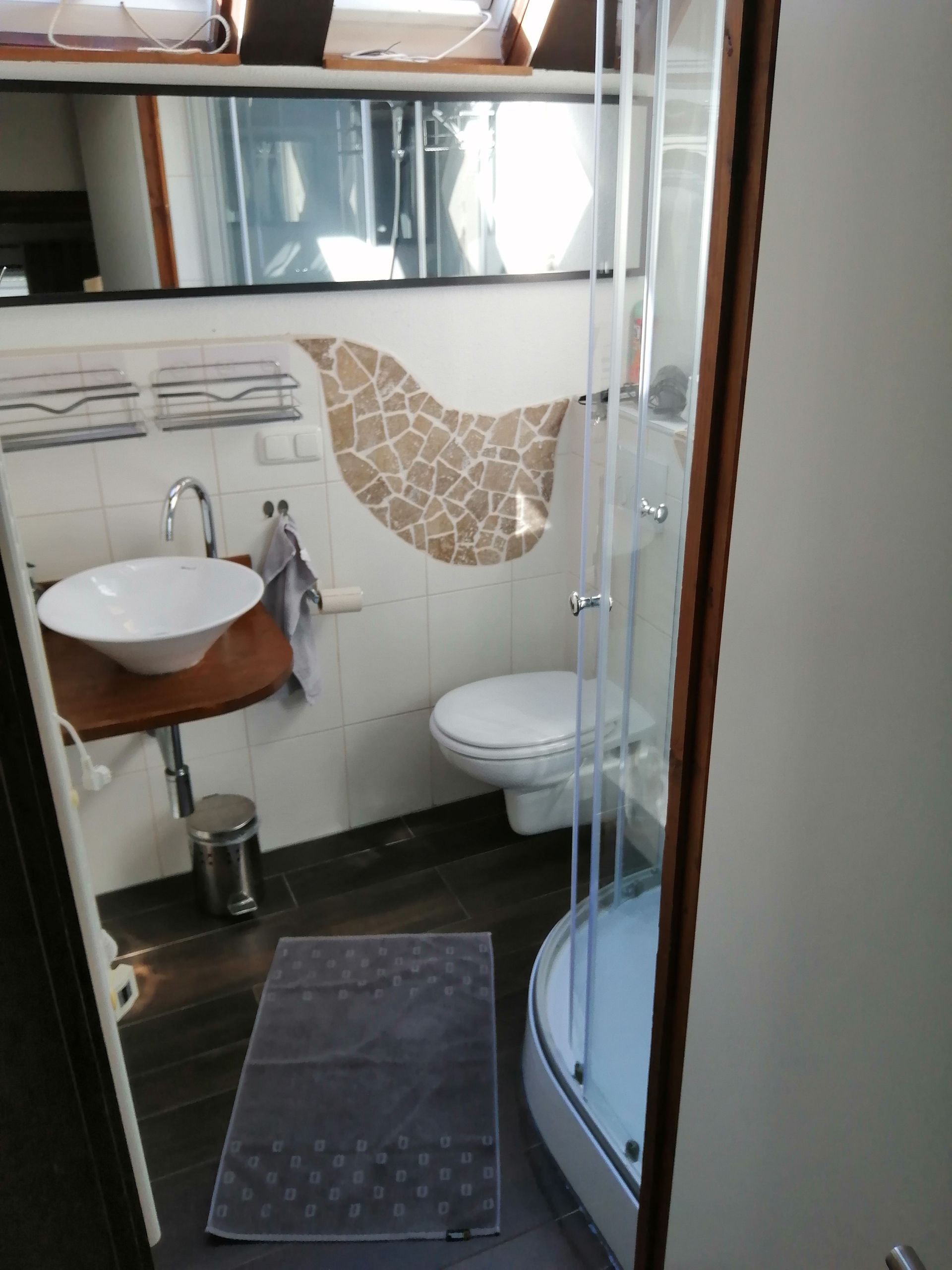 WC, großes Waschbecken, Dusche, großer Spiegel